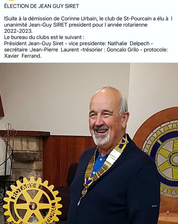 Jean-Guy SIRET, président du club, a accueilli les invités et leur a présenté les principales actions du club réalisées au cours de l'année rotarienne précédente ainsi que les projets en cours. Les fonds récoltés lors des manifestations ont été utilisés pour des actions locales.