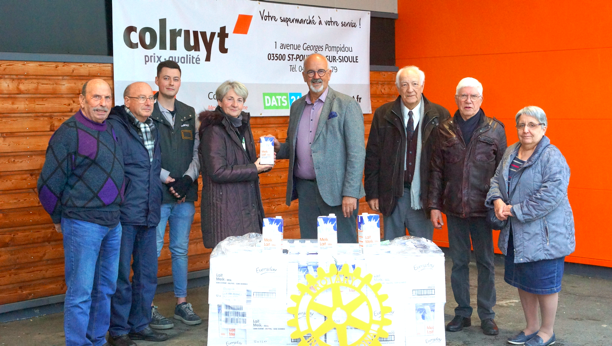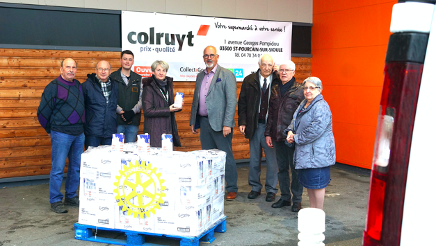 Le jeudi 23 février, le Président et les membres du Rotary-club de Saint-Pourçain et la direction du magasin Colruyt, madame Marina Girard représentée par son adjoint monsieur Axel Gardel, ont remis aux représentants des restos du coeur de St-Pourçain une palette de packs de lait afin que ces derniers puissent faire face aux besoins des usagers durant un mois.